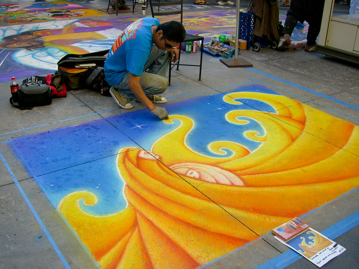 Here is Ender on day Two. On this day we applied many layers of blue for the sky. Ender uses a special patented tool for this process. He found it easier to smash the chalk first then smudging it on the concrete. This technique helped give the sky a nice gradation.